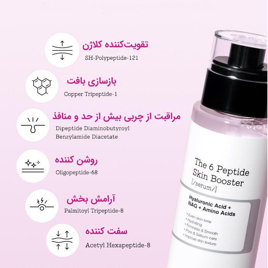 بوستر سرم تقویت کننده 6 پپتاید کوزارکس حاوی 6 پپتاید چندگانه است که به بهبود وضعیت کلی پوست مانند منافذ و چربی، سفتی، خطوط ریز، بافت و رنگ پوست و آرامش پوست کمک میکند. این محصول برای استفاده به عنوان اولین مرحله در روتین مراقبت از پوست ایدهآل است تا پوست را آماده و تقویت کند.