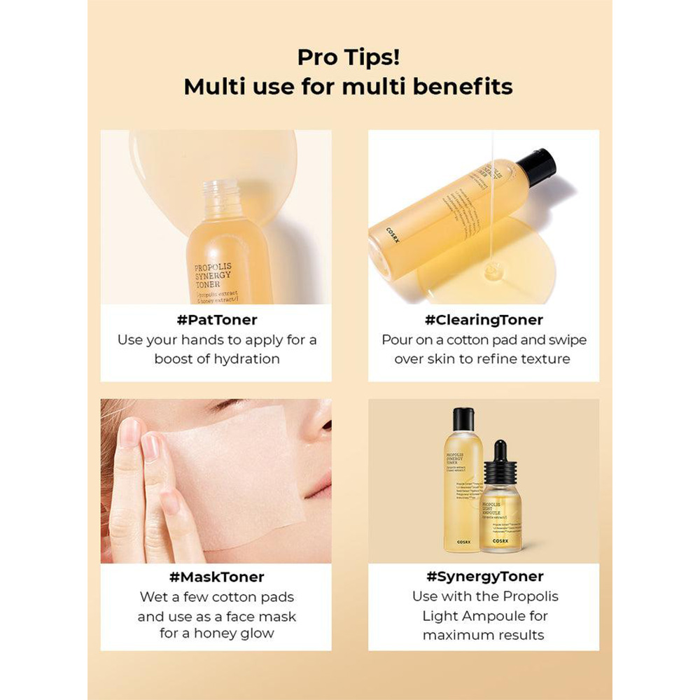 تونر پروپولیس(بره موم) کوزارکس دارای خواص ضد التهابی بسیار بالا است. به این معنی که برای آرام کردن پوست تحریک شده فوق العاده است که این به کاهش قرمزی و محو شدن هایپرپیگمانتاسیون پس از التهاب مانند اسکار آکنه کمک می کند. همچنین این تونردارای خواص ضد باکتری، ضد ویروس و ضد قارچ است. به همین دلیل برای افرادی که پوست حساس و مستعد جوش دارند، فوق العاده مفید است.این تونربه تحریک تولید کلاژن و تسریع بهبود زخم نیز بسیارکمک می کند.